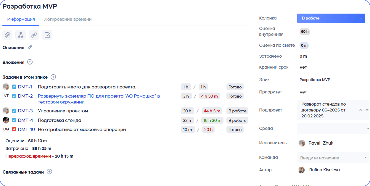 - Подключение к системам контроля версий (Git) и CI/CD для автоматического обновления статусов задач по результатам коммитов и сборок.