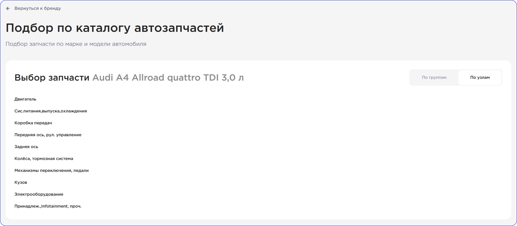 - Гибкая навигация. Пользователь последовательно выбирает марку, модель, поколение, модификацию, группу деталей и узел — шаг за шагом.