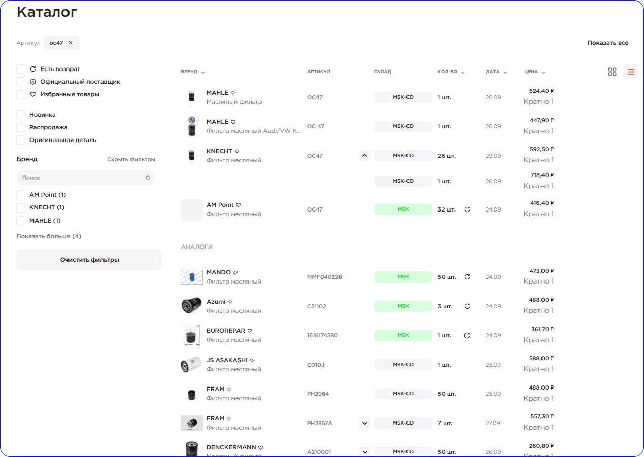 Система мгновенно находит все соответствующие детали — как оригинальные, так и аналоговые, если они есть в каталогах.