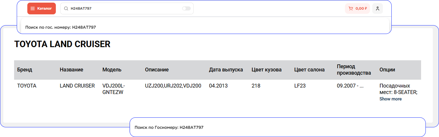 - Точность определения. Поиск по VIN или госномеру сразу находит точную модель и комплектацию автомобиля.