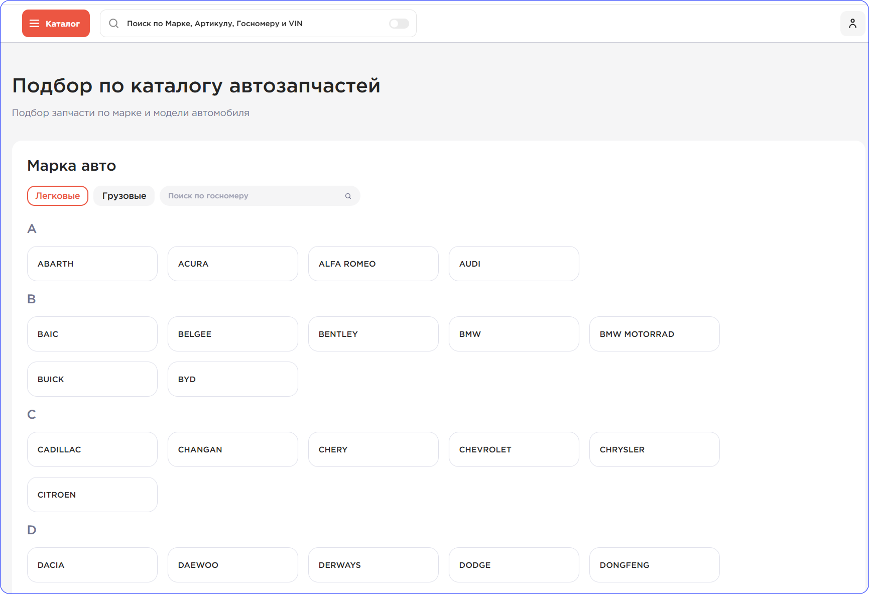 Для визуализации используется динамический интерфейс с формами, деревьями категорий и адаптивным дизайном. Марки распределены по табам «Легковые» и «Грузовые», что упрощает навигацию.