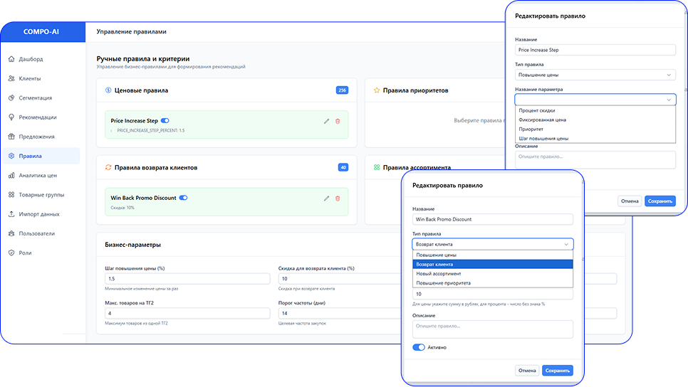 ✔ Товарные правила: приоритеты по товарным группам, продвижение конкретных позиций, ограничения по ассортименту.