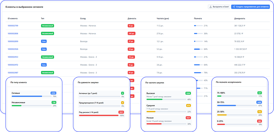 Система выявляет клиентов, которые давно не делали заказ, и формирует персональные предложения для их возврата. Это помогает восстановить продажи и удерживать клиентскую базу.