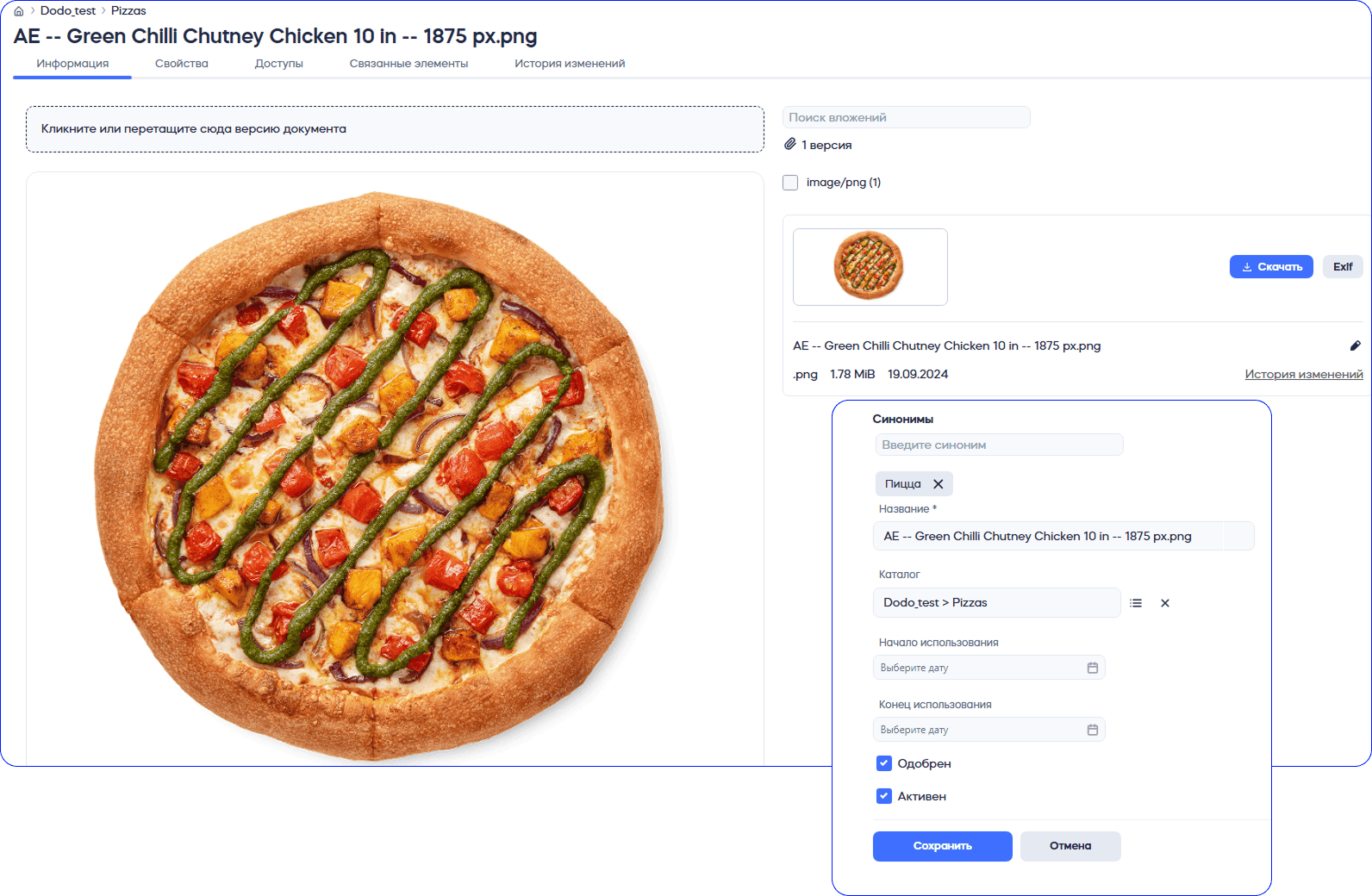 Функциональность карточки DAM-элемента реализована через интуитивные вкладки: