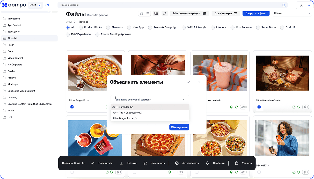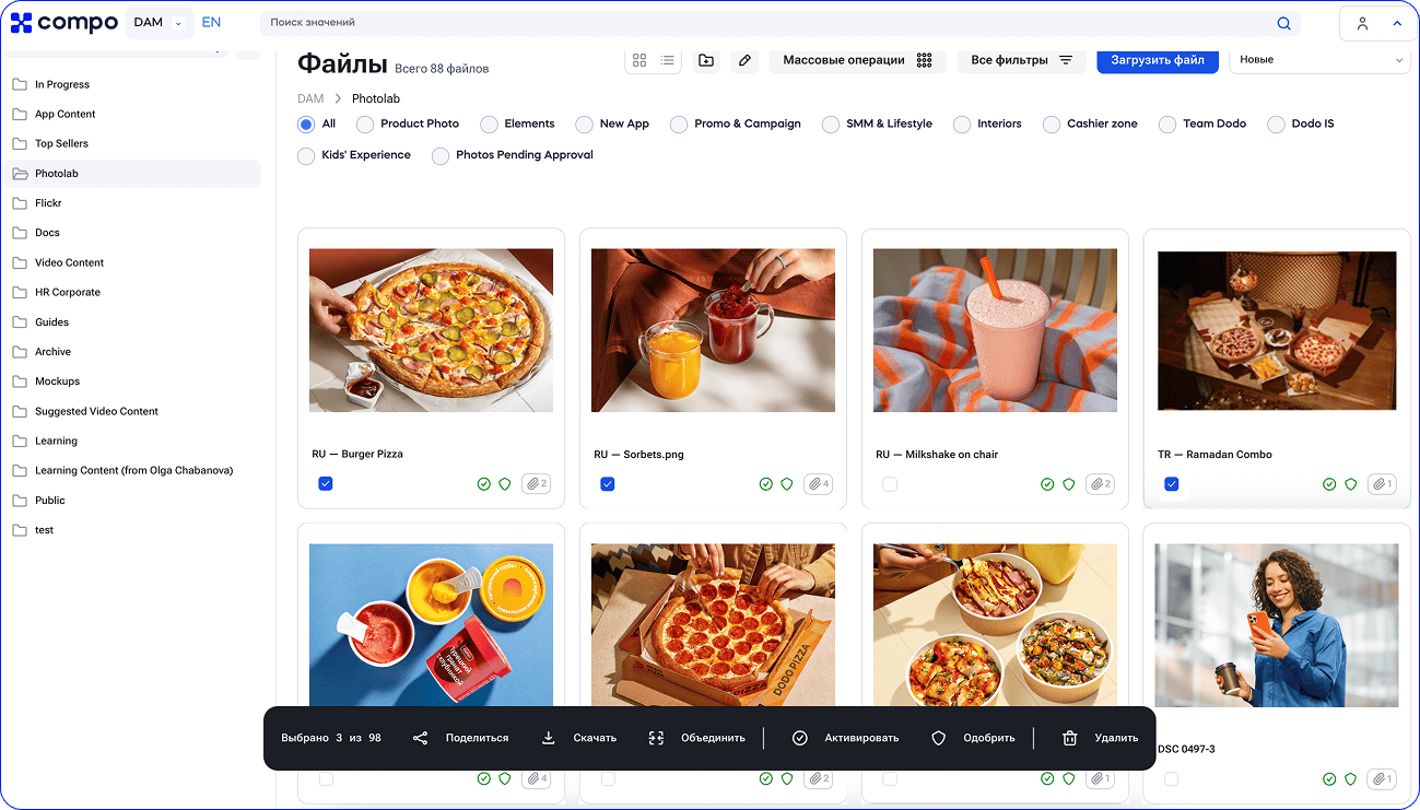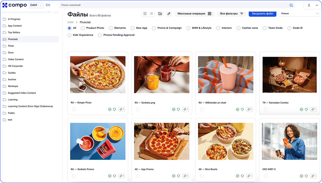 - Интеграция с CRM и франчайзинговым порталом для более широкого использования Compo DAM.